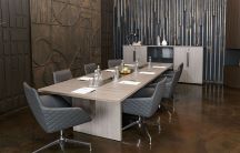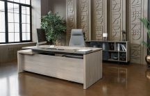 - Комбинация древесного и однотонного декоров в столах руководителя, тумбах, шкафах.
