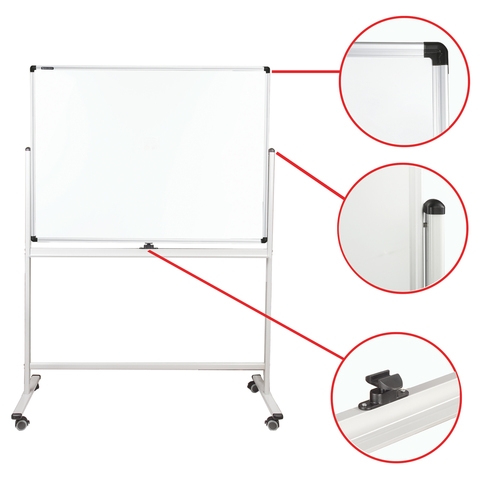 Лаковое покрытие предназначено для письма специальными маркерами для белой доски, а металлическая поверхность позволяет размещать информацию при помощи магнитов. Вращается в горизонтальной плоскости на 360 градусов. Легко перемещается на стенде. Алюминиевая рама придает доске необходимую прочность. Элементы крепления входят в комплект. Размер - 90х120 см. При должном уходе за рабочей поверхностью доски при помощи чистящей жидкости-спрея и стирателей BRAUBERG поверхность магнитно-маркерной доски прослужит более 10 лет.