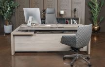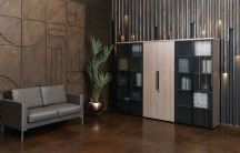 - Комбинация древесного и однотонного декоров в столах руководителя, тумбах, шкафах.